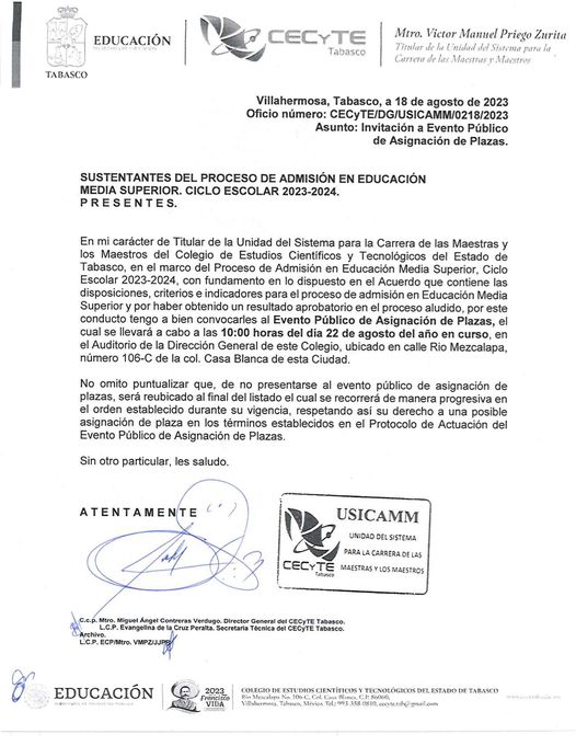 Evento Público de Asignación de Vacantes. Proceso de Admisión en Educación Media Superior. Ciclo Escolar 2023-2024.