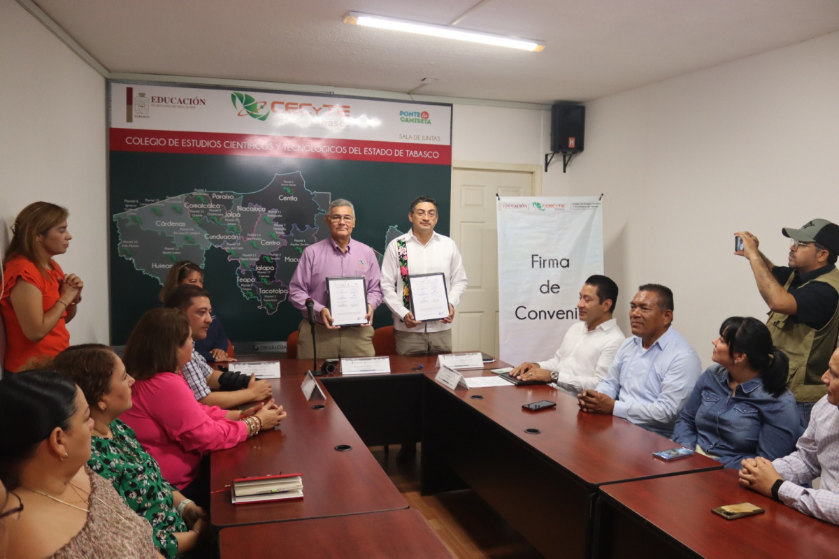 Como resultado de la vinculación entre instituciones hermanas, este día, el Lic. Pedro Joaquín Sánchez Cabrales, Director General del CECyTE Tabasco y el Dr. José Javier Torres Hernández, Director del Instituto Tecnológico de la Zona Olmeca, firmaron un convenio de colaboración, que permitirá a los estudiantes del subsistema, realizar su servicio social y práctica profesional; de igual forma, el intercambio académico a través de talleres, cursos y conferencias, entre otros beneficios.