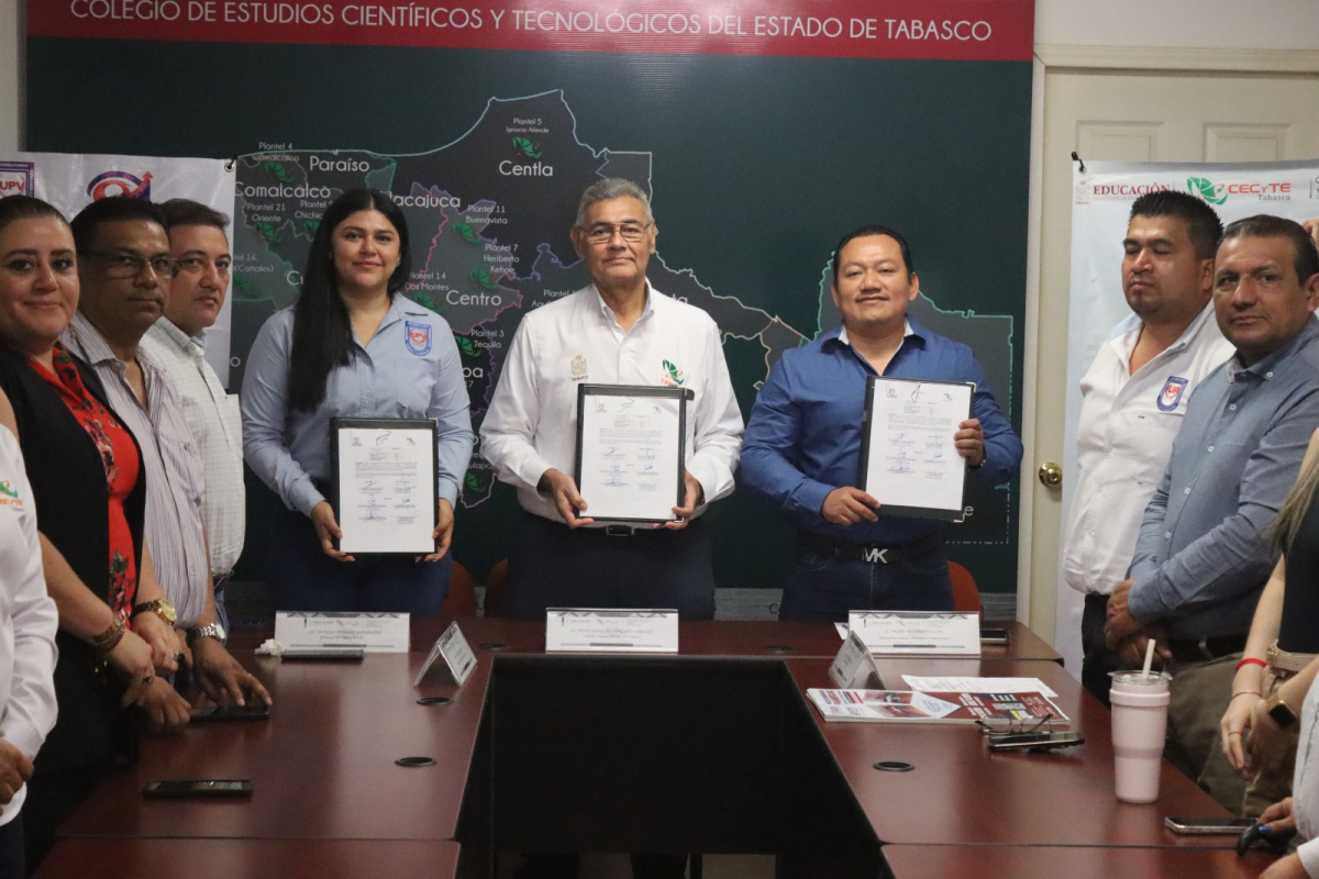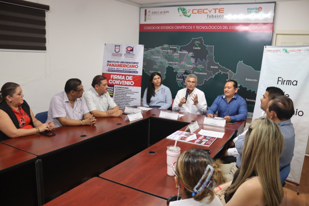 Como parte de las alianzas estratégicas con las instituciones de educación superior que buscan beneficiar a los estudiantes del CECyTE Tabasco, el día de hoy el Lic. Pedro Joaquín Sánchez Cabrales, Director General del CECyTE Tabasco y el Lic. Moisés Álvaro Pascual, Director del plantel sede Macuspana y Villa Benito Juárez del Instituto Universitario Panamericano firmaron un convenio de colaboración que brinda a alumnos y docentes oportunidades de formación.