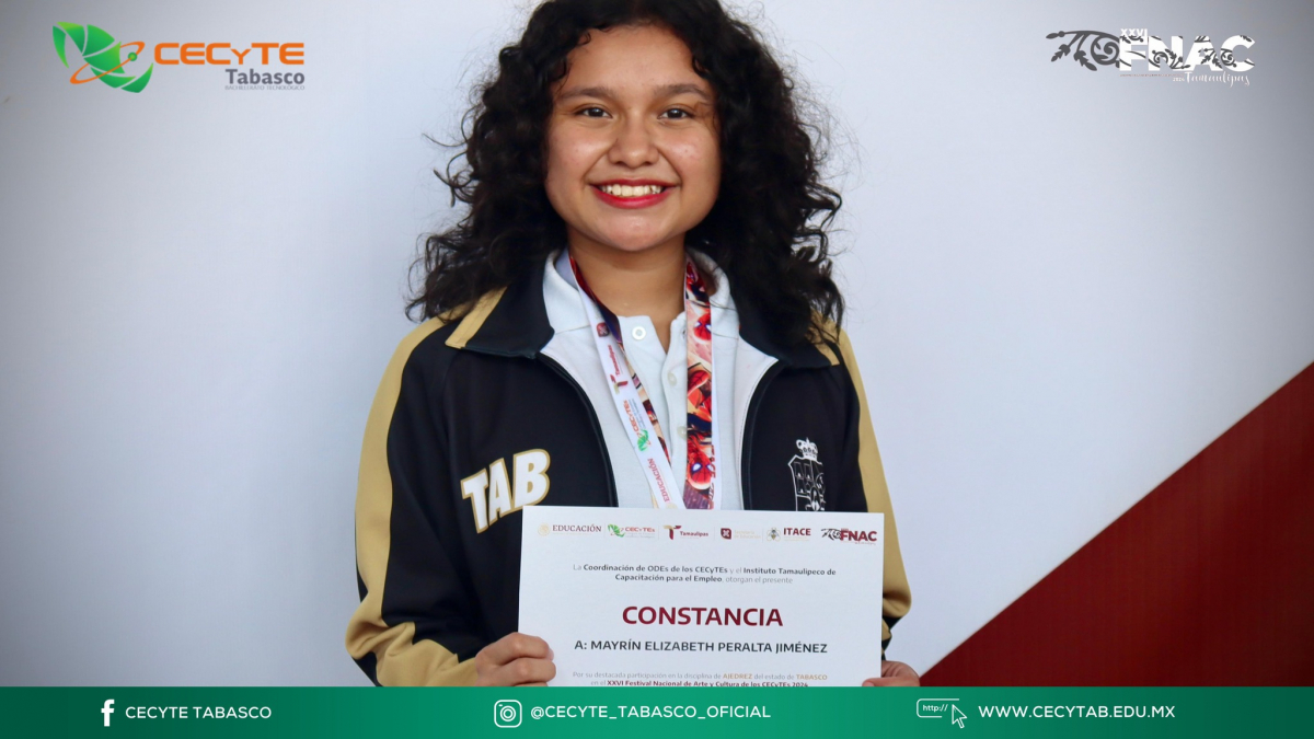Recibe Mención Honorífica a Nivel Nacional la alumna Mayrin Elizabeth Peralta Jiménez, en la categoría de Ajedrez por destacar en el Festival Nacional de Arte y Cultura 2024, en Tamaulipas.